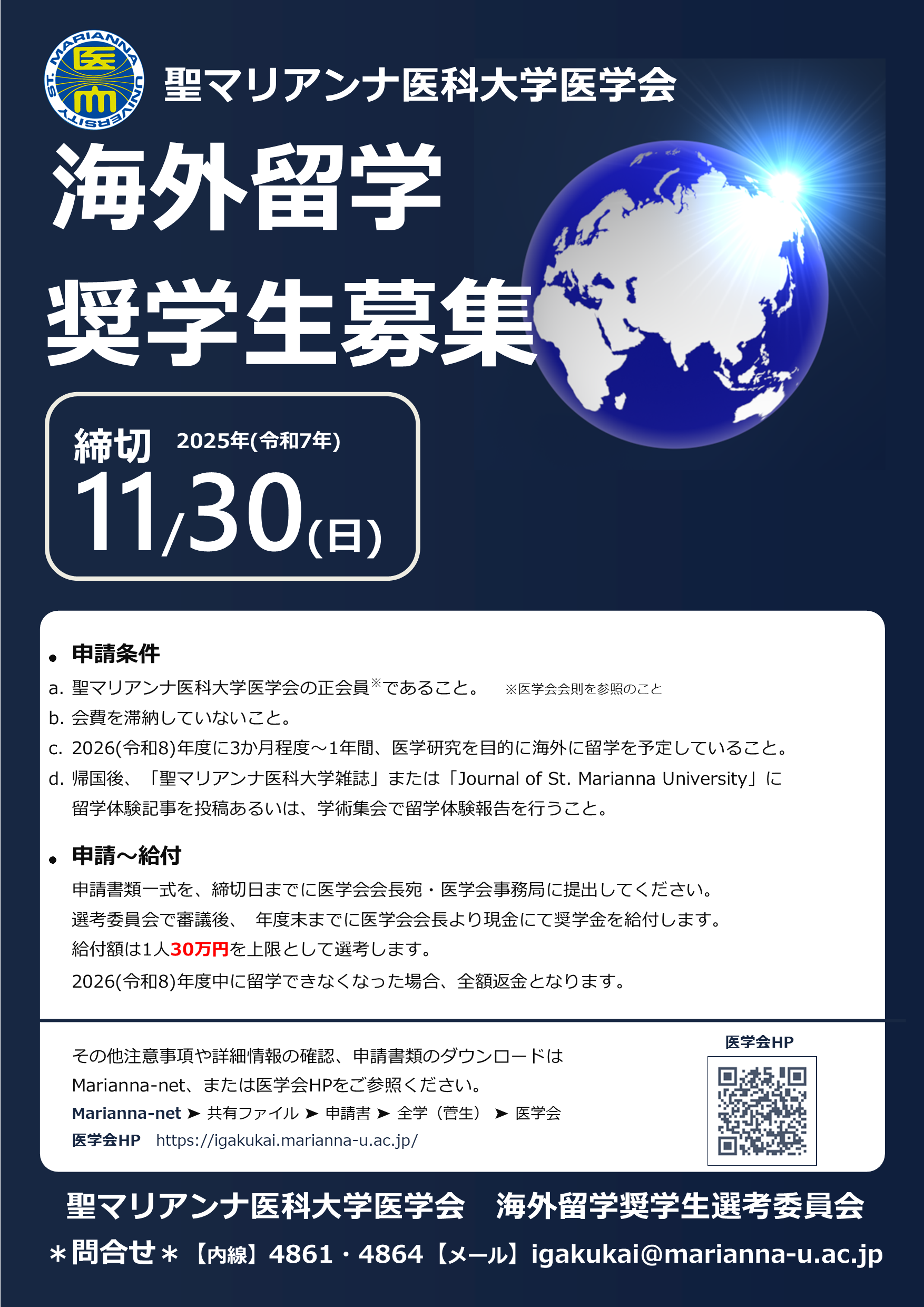 聖マリアンナ医科大学医学会では、海外奨学金制度を通じて海外に留学する本会会員に対して、奨学金を給付しています。